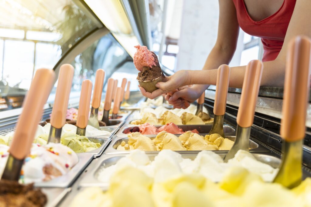 乳脂含量介於6–8%,氣泡含量低、質地緻密,溫度相對較高保存。常見於義式甜點店,口感濃郁卻不膩,是介於健康與風味間的平衡之選。